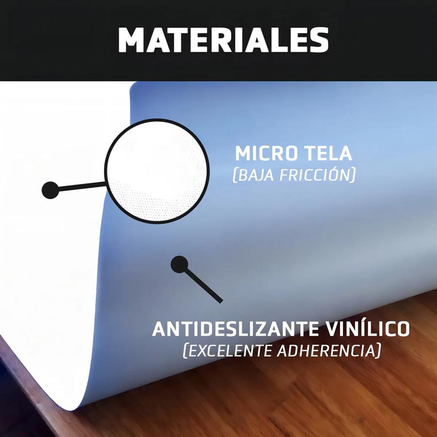 El material es una combinación de goma espuma de alta densidad, una capa de goma antideslizante y tela sintética en la superficie, lo que le da una textura suave pero no resbalosa al pad.